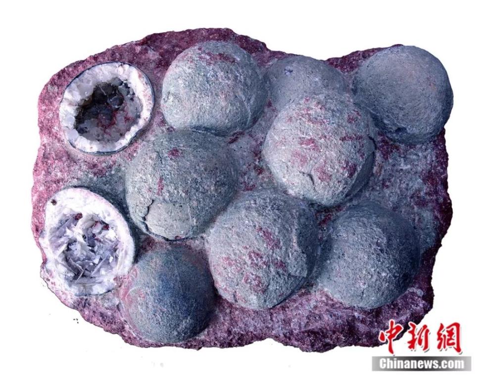 白垩纪晶圆形恐龙蛋化石。每枚蛋通长9.3厘米,通宽8.8厘米,通高7.0厘米。7000万年前中生代白垩纪晶体圆形恐龙蛋化石,整窝共10枚,蛋内呈晶体状。图片来源:河源市恐龙博物馆