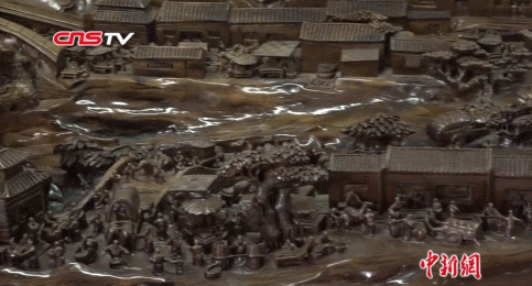 另一位手工达人是来自重庆的木雕爱好者谭明华,他在一段金丝楠乌木上雕刻出立体版的《清明上河图》,其人物、建筑、街景等,都雕刻得栩栩如生,充满立体感。