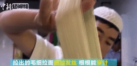 在青海省化隆县拉面产业培训中心内,一位拉面师傅现场展示拉面技艺。据测量,他拉出的毛细拉面直径为0.5毫米,根根能穿针,真正细如发丝。