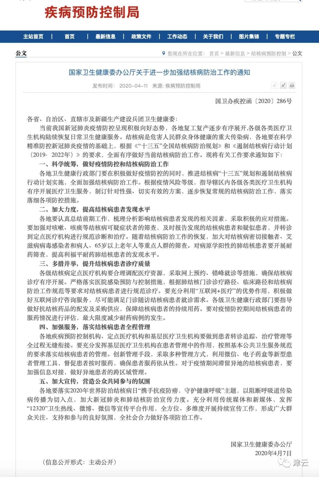 【国家卫生健康委办公厅关于进一步加强结核病防治工作的通知】国卫办疾控函〔2020〕286号
