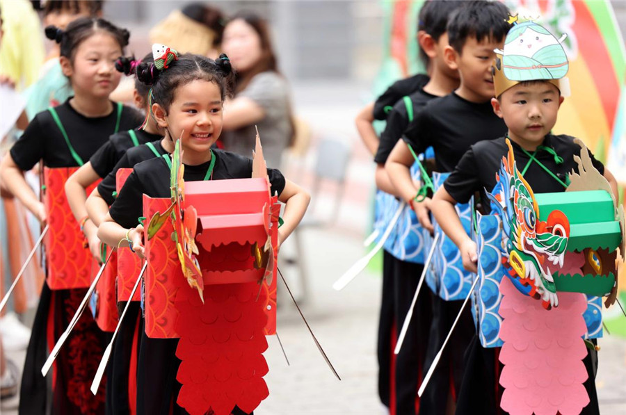 6月16日,合肥市大通路小学的“乐端午·粽情游”趣味游园活动现场,孩子们进行传统汉服展示。解琛摄