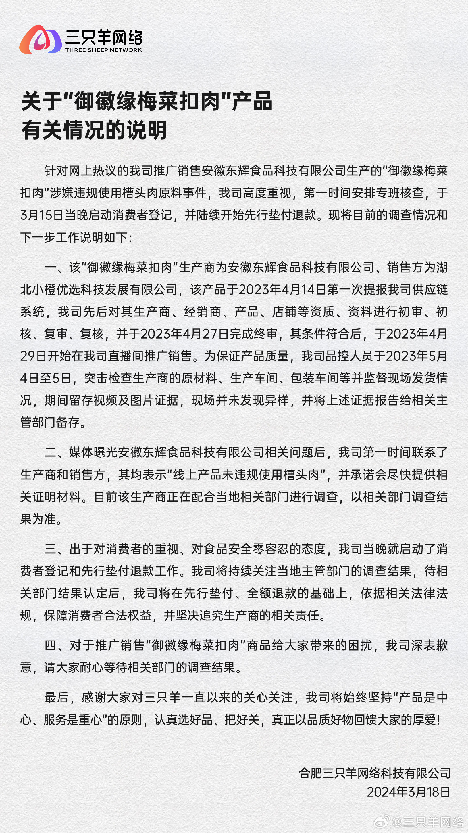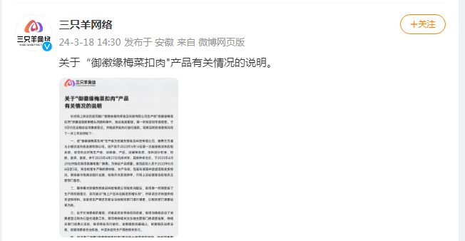 合肥三只羊网络科技有限公司官方微博发布关于“御徽缘梅菜扣肉”产品有关情况的说明。