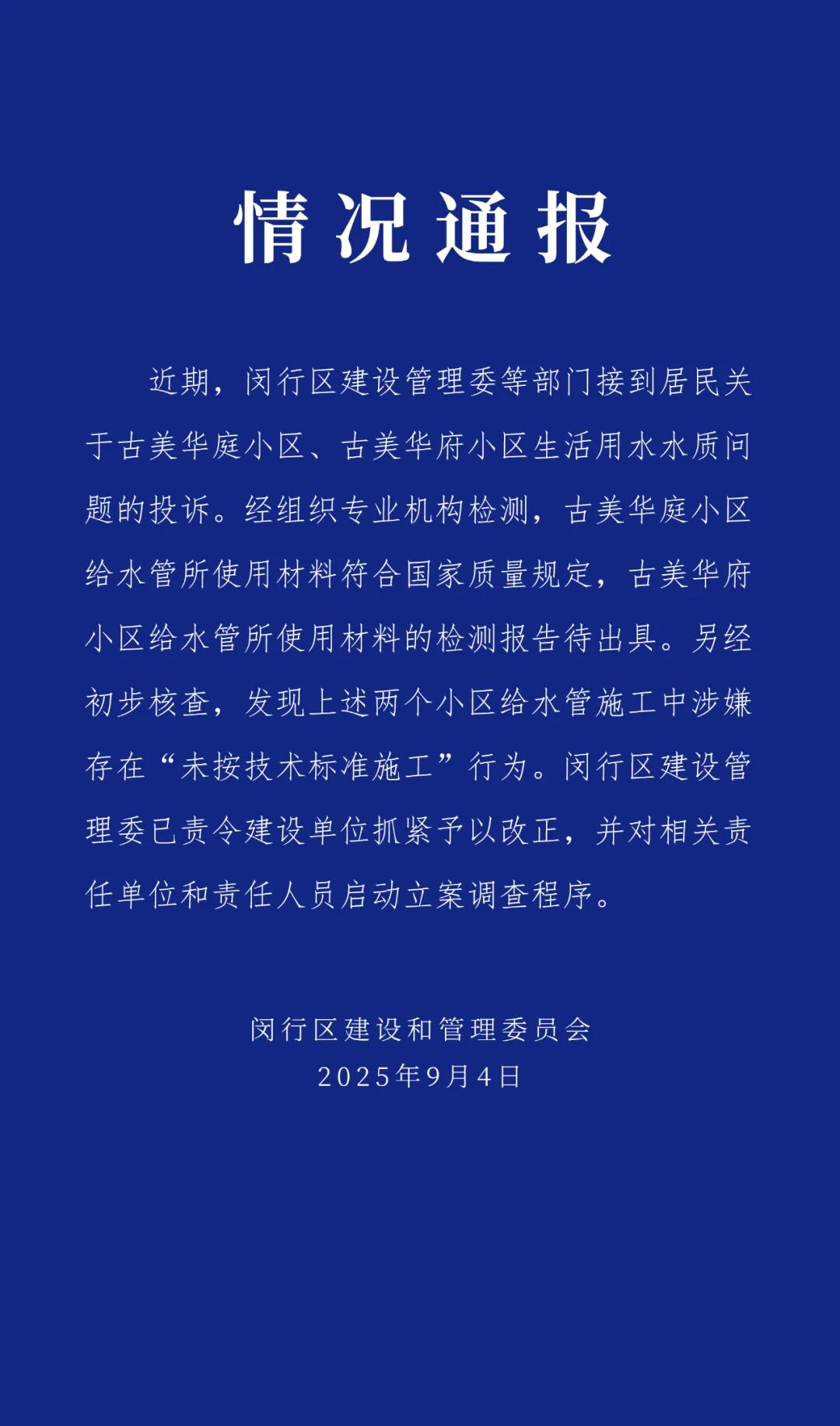 上海闵行区通报“关于两小区生活用水水质问题投诉”:涉嫌存在“未按技术标准施工”行为,已责令抓紧改正