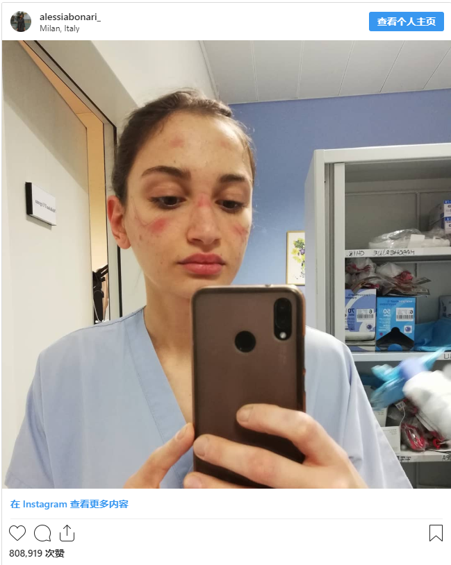 据雅虎新闻网报道,阿莱西亚⋅博纳里(Alessia Bonari)是意大利一名年轻的女护士,在意大利米兰的一家医院工作。由于当地疫情严峻,医护人员不得不穿着防护服、戴上防护面罩进行长时间工作。
