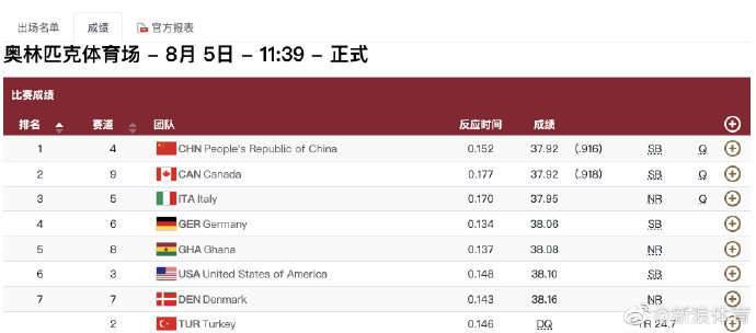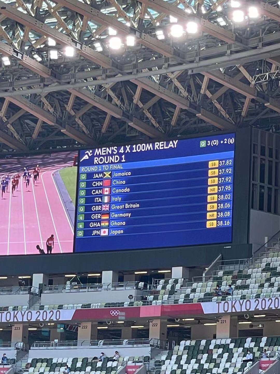 目前在两组所有参赛选手中,牙买加以37秒82的成绩位列第一,中国、加拿大位列第二和第三名。