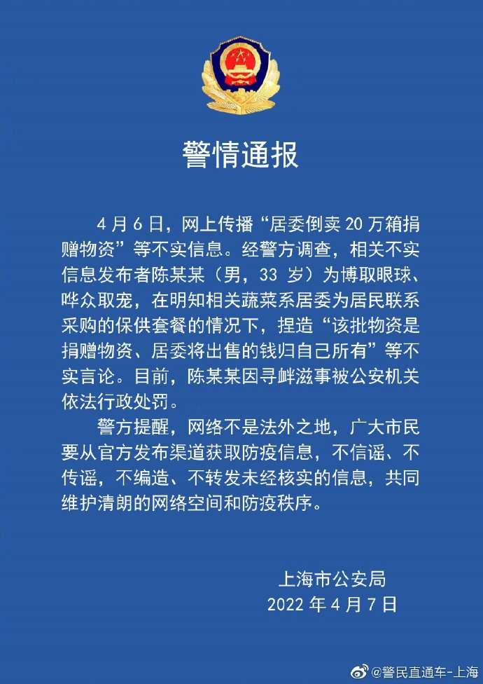 记者从上海市公安局了解到,4月6日,网上传播“居委倒卖20万箱捐赠物资”等不实信息。经警方调查,相关不实信息发布者陈某某(男,33岁)为博取眼球、哗众取宠,在明知相关蔬菜系居委为居民联系采购的保供套餐,却捏造成“该物资是捐赠物资、居委将出售的钱归自己所有”等不实言论。目前,陈某某因寻衅滋事被公安机关依法行政处罚。