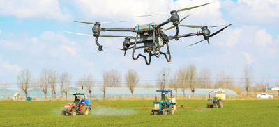 山东省青岛莱西市田间,运用北斗导航的植保无人机、长臂喷雾机在对小麦进行管护。张进刚摄(人民视觉)