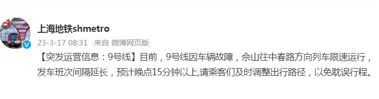 上海地铁:9号线因车辆故障,佘山往中春路方向列车限速运行