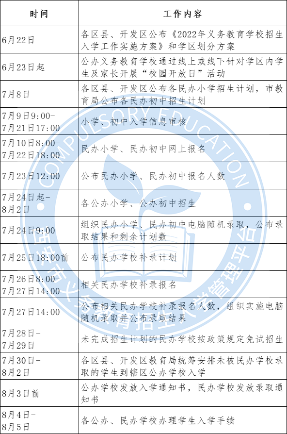 今年我市小学、初中招生工作主要日程安排如下: