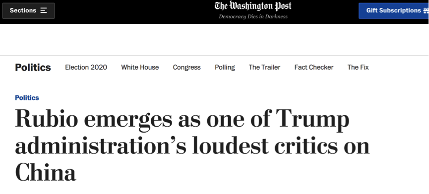 惯用“双重标准”的卢比奥自2010年当选议员以来,是位“逢中必反”的政客,从主张封杀中国高科技公司到推动“香港人权与民主法案”,从反对美国企业投资中国到叫嚣中国赔偿,到处都有他忙碌的身影。《华盛顿邮报》曾这样评价,卢比奥是“特朗普当局中最聒噪的中国批评者”。
