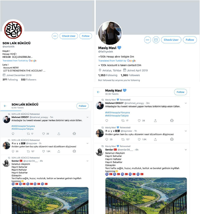 此外,调查发现,在巴拉圭和土耳其的许多账户,包括一些最活跃的账户,基本都像是已经被黑客入侵,并重新用于网络的“傀儡”账户。它们看起来像真实账户,但最近的转发行为和频率却不像真实用户。