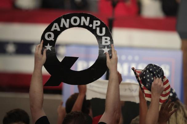 △“QAnon”组织在2018年特朗普总统的集会上签名 图片来源:美国Politico政治新闻网