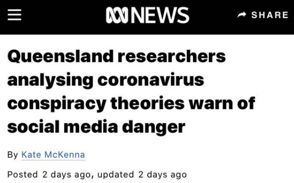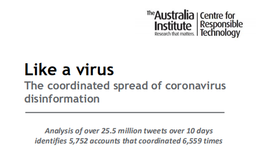 澳大利亚研究院委托昆士兰科技大学专家,针对3月下旬推特上260万条与新冠病毒有关的推文,以及在10天时间内对这些推文的2550万次转发作了分析,发现有5752个推特账户以一致的方式对新冠病毒相关信息转发了6559次, 并且散播有关“新冠病毒是中国制造的生化武器”阴谋论。