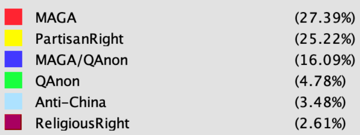 其中,三分之二账户的个人资料表现为特朗普 、“QAnon” 、美国共和党以及右翼势力的支持者 。其余三分之一中,一部分为反华账户,经常发布涉及种族主义和散布仇恨言论;另一部分为宗教团体中的右翼分子。而这些账户或者是为政治目的服务,或者是为了推广网站链接,牟取商业利益。