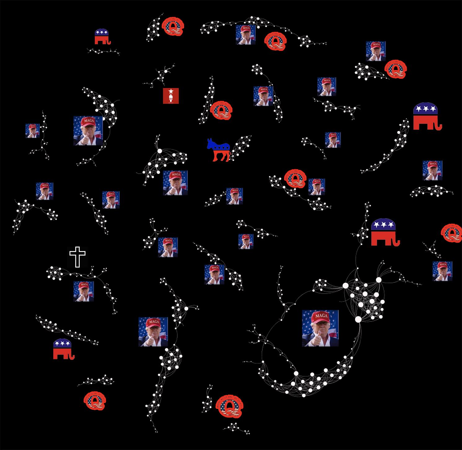 △此图表现了在一分钟之内发送同样内容的不同账号之间的关联。其中,不同的图标(特朗普、共和党、QAnon阴谋论团体等)象征着这类账号支持的对象。
