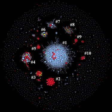 研究组通过海量数据对账号的真实性进行判断,并绘制了转发路径统计图。其中,蓝色代表真实的用户,红色为机器人,黄色为不确定的用户。