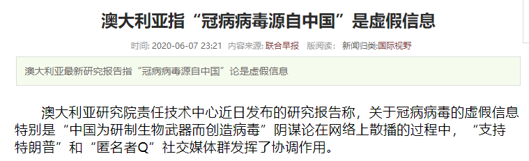 近日,澳大利亚研究院一份长达27页的调查研究报告《如同病毒:新冠病毒错误信息的有组织散播》显示,今年3月以来,一批有组织的“水军”在社交媒体上散布“新冠病毒为中国政府在武汉病毒研究所人为制造的生化武器”的阴谋论。报告的作者蒂莫西·格雷厄姆日前表示,这些账号多数为支持特朗普的极右翼团体所操纵。 澳大利亚研究报告:水军 炮制中国新冠病毒阴谋论