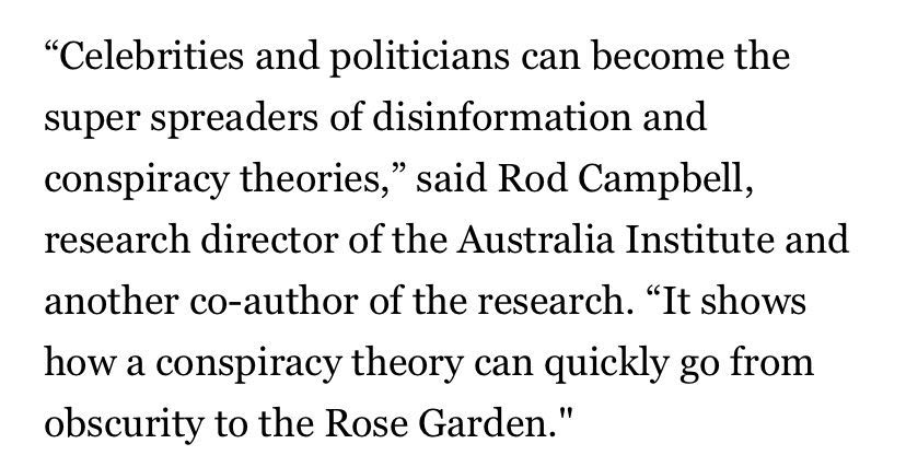 “名人和政治人物可以成为虚假信息和阴谋论的超级传播者”,澳大利亚研究所的研究主任、该研究的另一位合著者罗德·坎贝尔说,“它显示了谣言如何能够迅速从默默无闻到人尽皆知。”