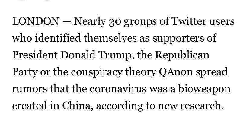 美国Politico政治新闻网6月2日报道称,最新研究显示,超过30个“特朗普支持者”和“QAnon”的社交媒体群散布谣言称,新冠病毒是在中国制造的一种生物武器。