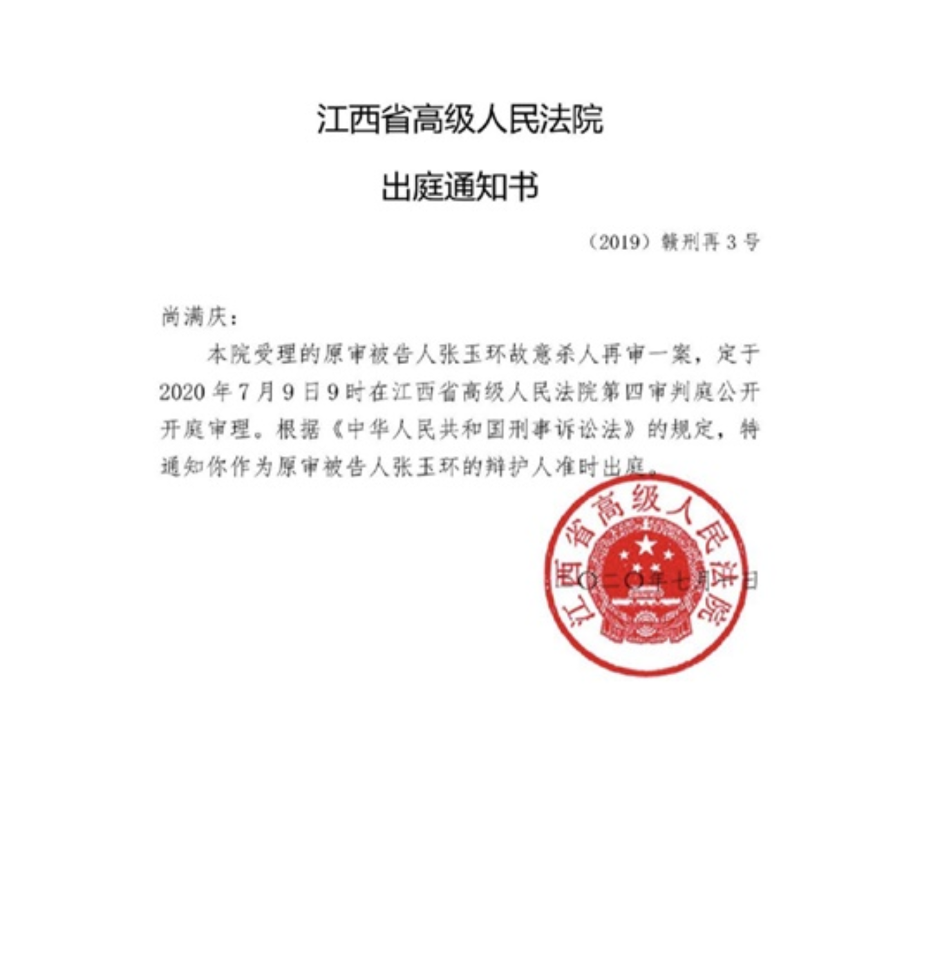 7月1日,江西高院作出的出庭通知书显示,该院定于7月9日9时在江西高院第四审判庭公开开庭,再审张玉环故意杀人案。