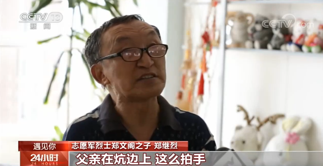 志愿军烈士郑文阁之子 郑继烈: 在我的印象中我就只知道,我们家过去搭的大炕,我往炕里滚,父亲在炕边上这么拍手,这个场面我总记得,虽然我小,但是我记得这个场面,别的我就没什么(印象)了。