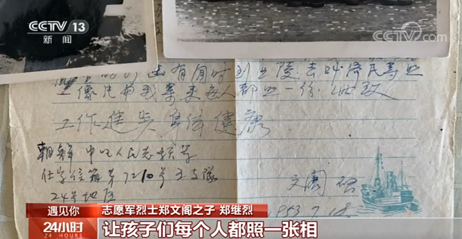 志愿军烈士郑文阁之子 郑继烈: 1953年我六叔入团了,给我父亲写信,我父亲(回)这封信是鼓励他,说你是新中国的好青年,一定要努力。(信)在最后时写道,有时间你(我六叔)到北陵去,让孩子们每个人都照一张相,还有你嫂子,我想他们。