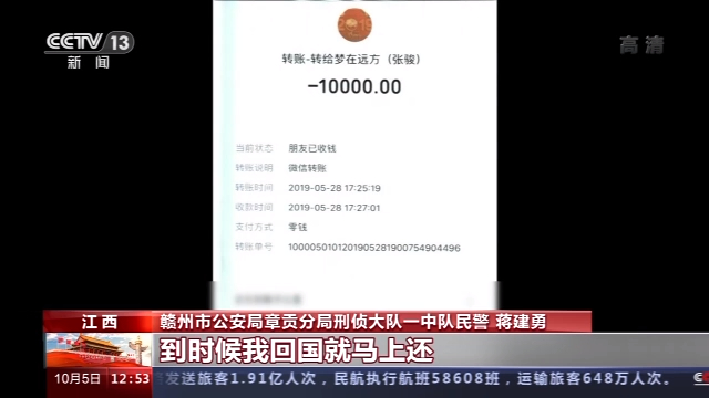 赣州市公安局章贡分局刑侦大队一中队民警 蒋建勇: 说人在国外,什么银行账号不能使用,或者说自己的微信也不能转账什么的,然后就是说,比如说在国外要请客户吃饭,就差那么一些钱。