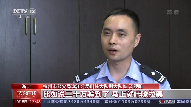 杭州市公安局滨江分局刑侦大队副大队长 汤颂阳: 我们通常的有些诈骗就是把你的钱,比如说二十万骗到了,马上就咔嚓拉黑,他们不这么做,他们还继续陪你聊几天,会慢慢地安抚她,慢慢地变淡,让被害人觉得我只是就是谈了这么一次恋爱,谈了一次网恋。