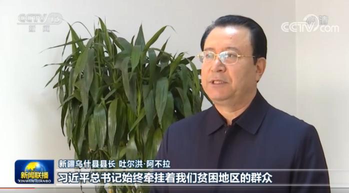 新疆乌什县县长 吐尔洪·阿不拉: 习近平总书记始终牵挂着我们贫困地区的群众,他亲自指挥、亲自部署脱贫攻坚工作,现在我们乌什县摘掉了贫困帽子。正如中央经济工作会议说的,我们交出了一份人民满意、世界瞩目、可以载入史册的答卷,我们24万群众都是受益者和见证者。