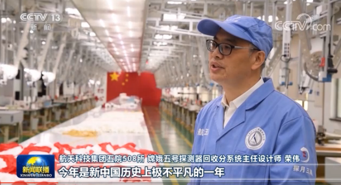 航天科技集团五院508所 嫦娥五号探测器回收分系统主任设计师 荣伟: 今年是新中国历史上极不平凡的一年,对我们航天也是,嫦娥五号是我们中国航天复杂度最高、技术跨度最大的一次任务,能够圆满完成,就像总书记说的,是发挥新型举国体制优势,攻坚克难取得的又一重大成就。