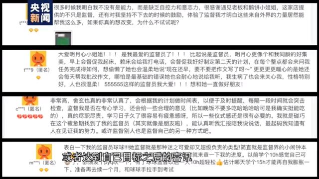 自律监督师 朱河存: 我们也经常会收到考试上岸,或者达到自己目标之后的喜讯,这个时候我们会感觉很有成就感,感觉我们有真正帮助到了别人,做了自律监督师之后,看见很多人都在努力地生活,朝着自己的目标一步步前进,这让我也很受启发,也约束自己更加自律。