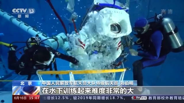 中国人民解放军航天员大队特级航天员 刘伯明: 我们在水下训练一般在六个小时左右,基本上到服装的极限。组装工具到机械臂上面,在水下训练起来难度非常大。把我们的绞线、舱外操作台安上去,人再爬到这个机械臂上去,接近七八个小时。一出来之后,衣服都是湿的,水洼洼的。