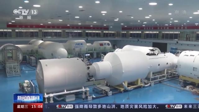 总台央视记者 刘笑宇: 我身边的白色大家伙,就是我们航天员中心研发的空间站舱段模拟器,模拟器内部的布局,是按照我们现在的空间站内部的空间和装备的配置来进行设置的。我们每名航天员都要在这个空间站舱段模拟器中进行长时间的训练,训练是完全模拟航天员在太空中的工作生活和飞行来进行的。