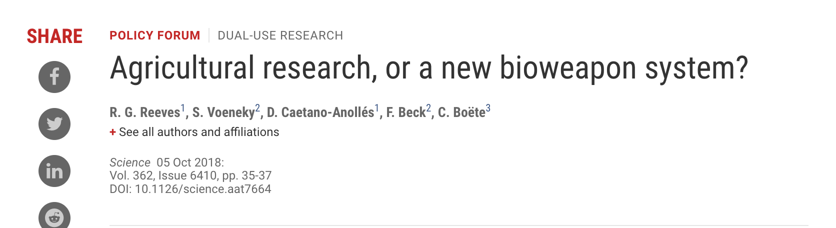 德国遗传学家盖伊·里夫斯在《科学》杂志撰文称:“这到底是农业研究,还是一种新的生物武器系统?”