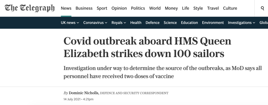 就在演习开始两天后,7月14日,英国媒体报道称,一名英国皇家海军发言人证实,“伊丽莎白女王”号出现了新冠疫情,大约有100名士兵被感染。与该航母随行的其他几艘军舰也受到了影响。
