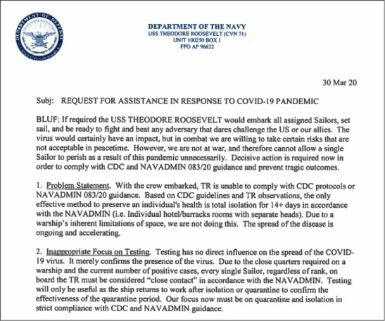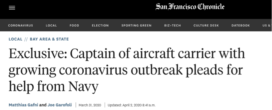 2020年3月31日,《旧金山纪事报》报道,他们获得了美国“罗斯福”号舰长克罗泽尔上校在30日写给上级的“求援信”,标题是《请求获得应对新冠肺炎疫情的援助》。