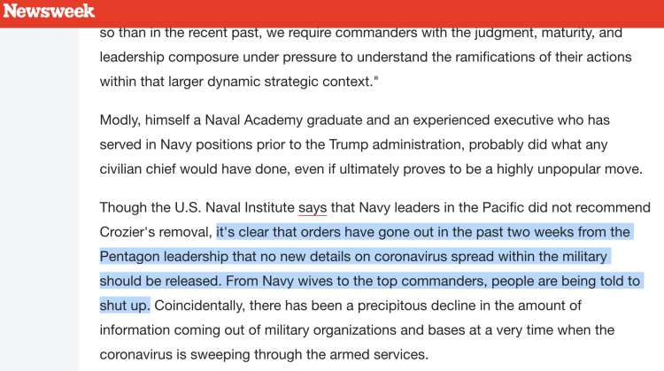 美国《新闻周刊》注意到,五角大楼曾下达命令,要求不得公开军队内部疫情的最新细节。从海军士兵配偶到最高指挥官,都被告知要闭嘴。