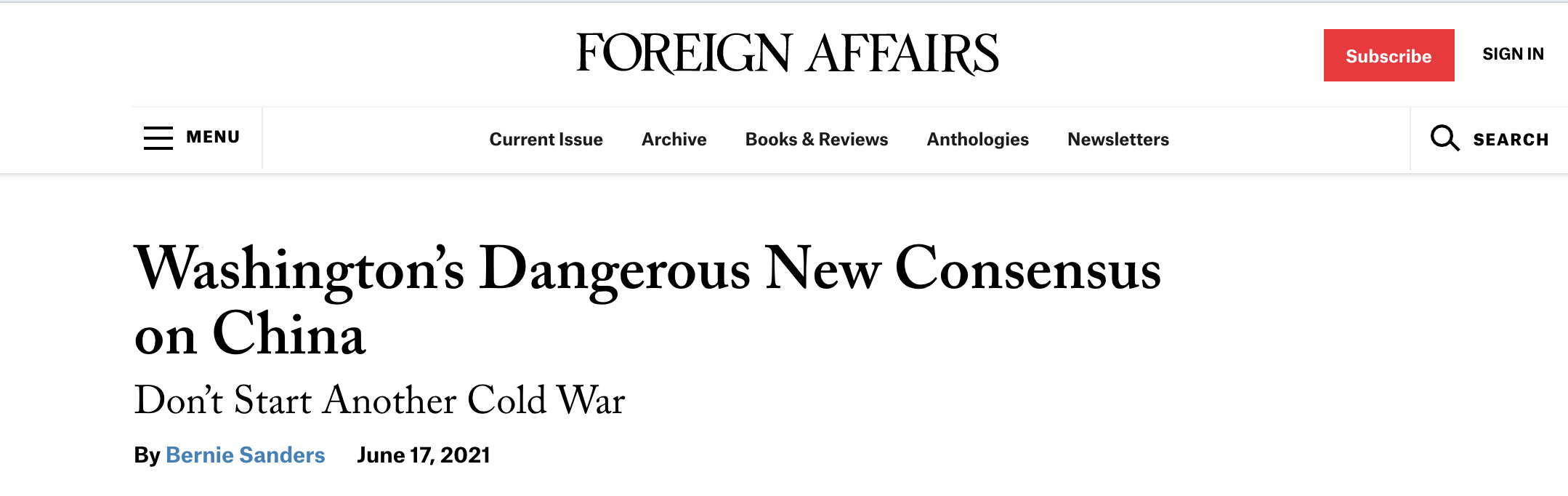 2021年6月,美国民主党参议员桑德斯在《外交事务》杂志上发表了一篇题为《不要开启另一场冷战》的文章,其中指出: