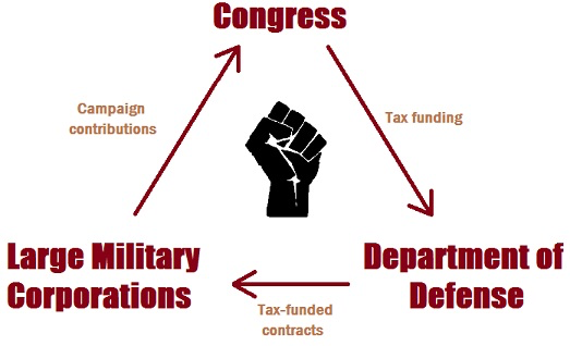 军工企业通过培养专业人才进入美国政府,以各种理由游说政府增加军费开支,通过不正当的手段影响美国政府的内外政策,唯一的目的就是扩大军费开支,拿到军事部门的订单。