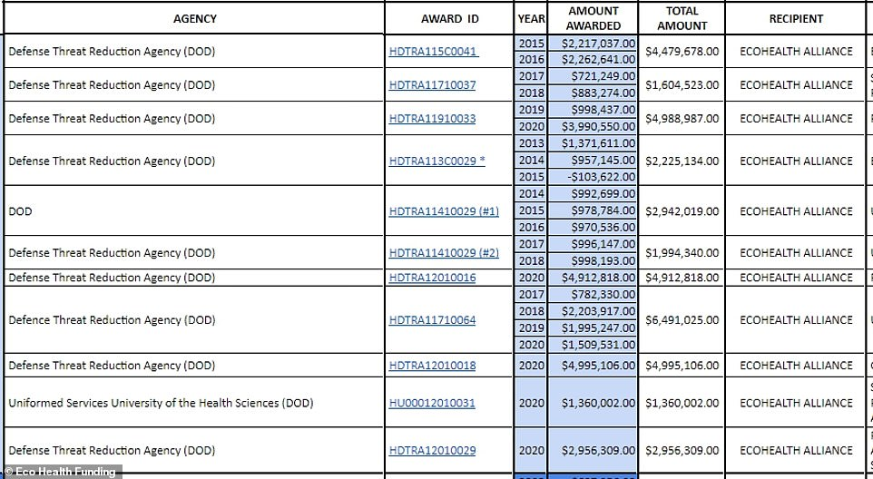 据报道,从2017年到2020年,生态健康联盟从美国政府共获得约1.23亿美元的资助,其中最大的金主是美国国防部。
