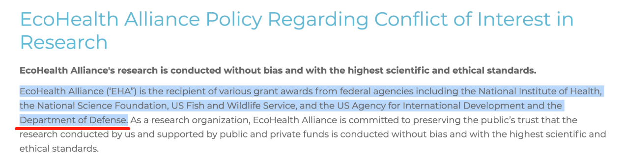 《每日邮报》在报道中提到这样一个细节,虽然生态健康联盟的最大金主是美国国防部,可耐人寻味的是,在其官方网站上,只在“隐私政策”一栏中很低调地提到了美国国防部。