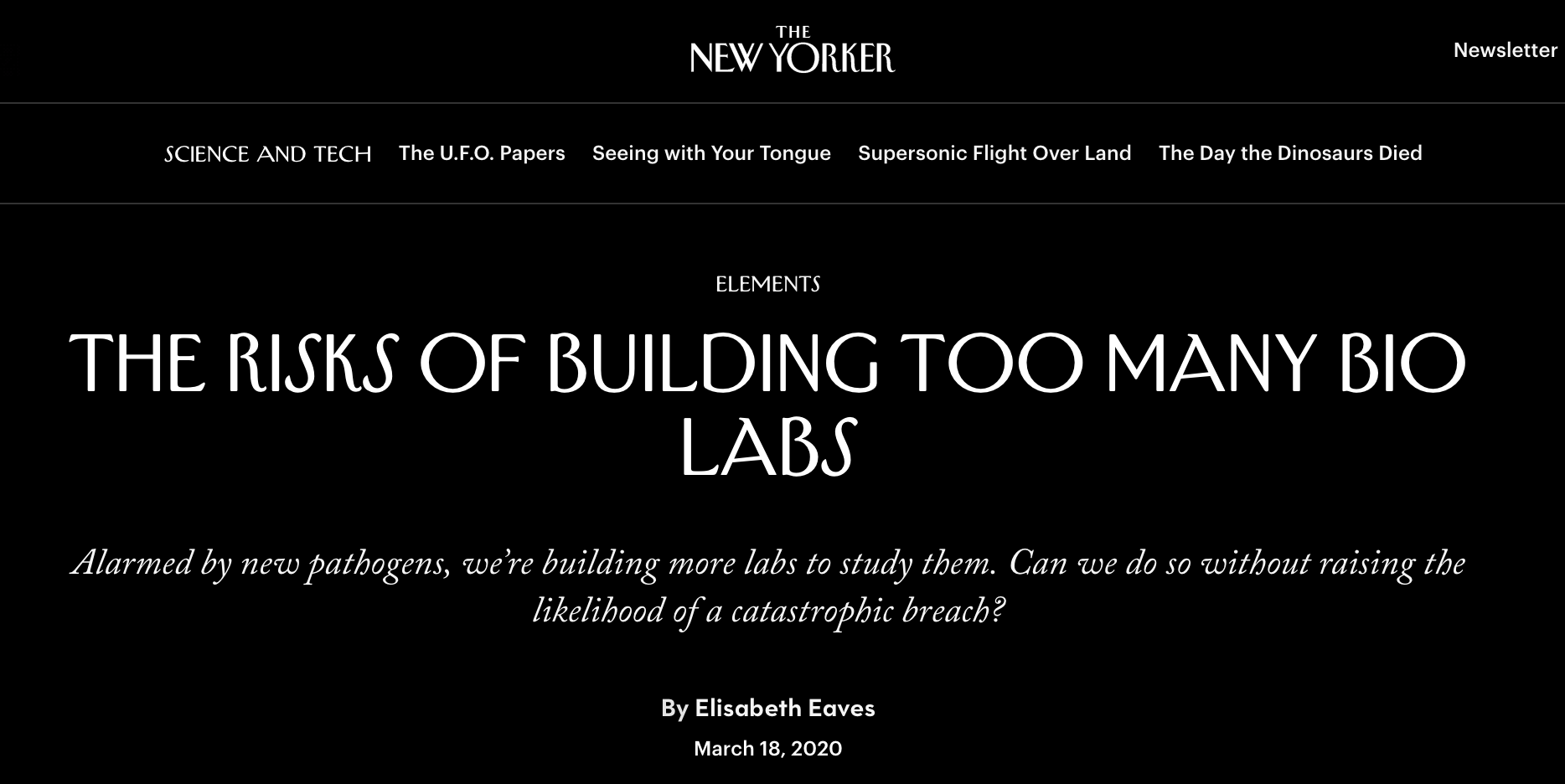 2020年3月18日,美国《纽约客》杂志发表评论文章,质疑美国是否拥有太多生物实验室。