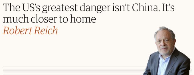 今年6月,美国前劳工部长罗伯特·海希在英国《卫报》发表文章,题为“美国的最大危险不在于中国,而在国内”。