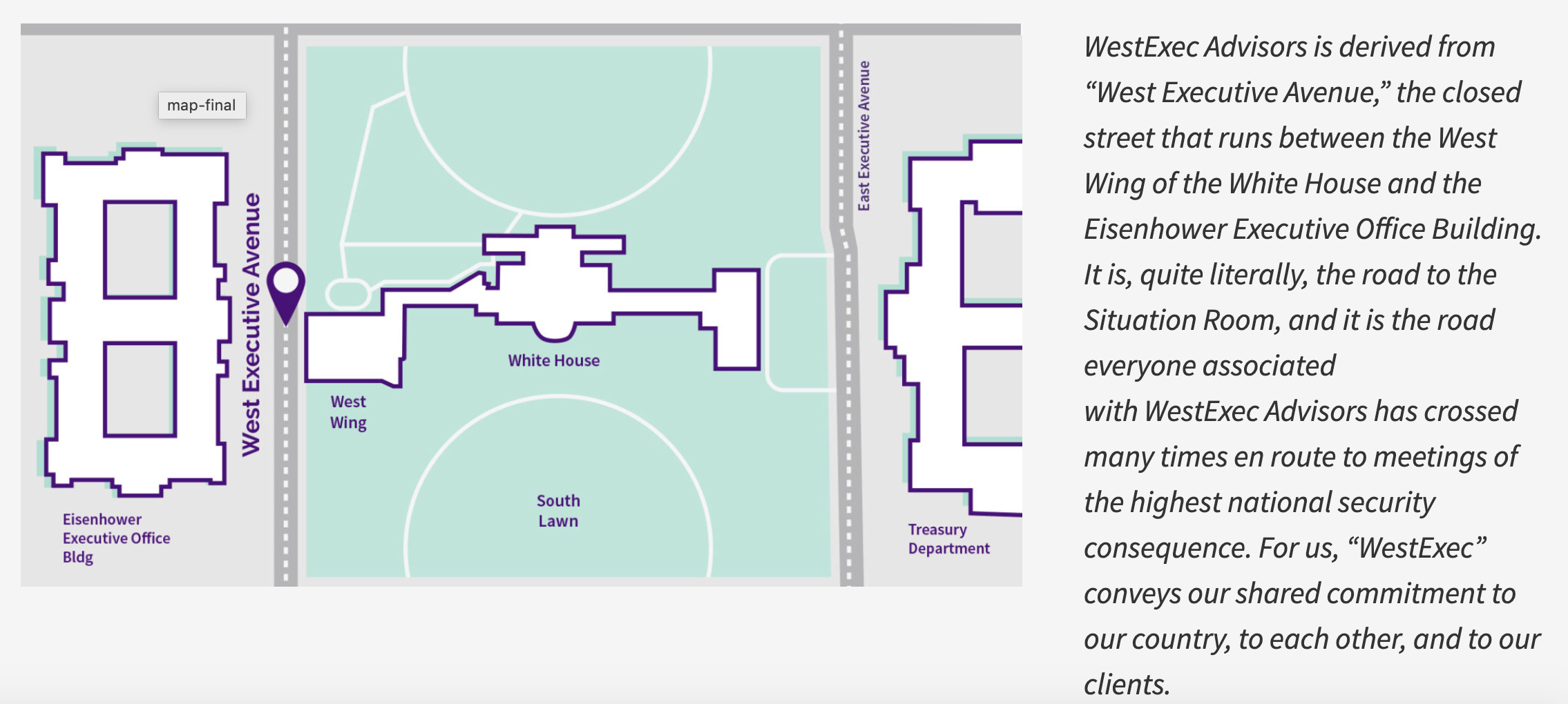 在WestExec的官网首页上高调地放了一张白宫地图,白宫西翼办公室West Wing,西行政大道West Executive Avenue,公司的名称WestExec就取自两者的结合,与白宫的联系耐人寻味。