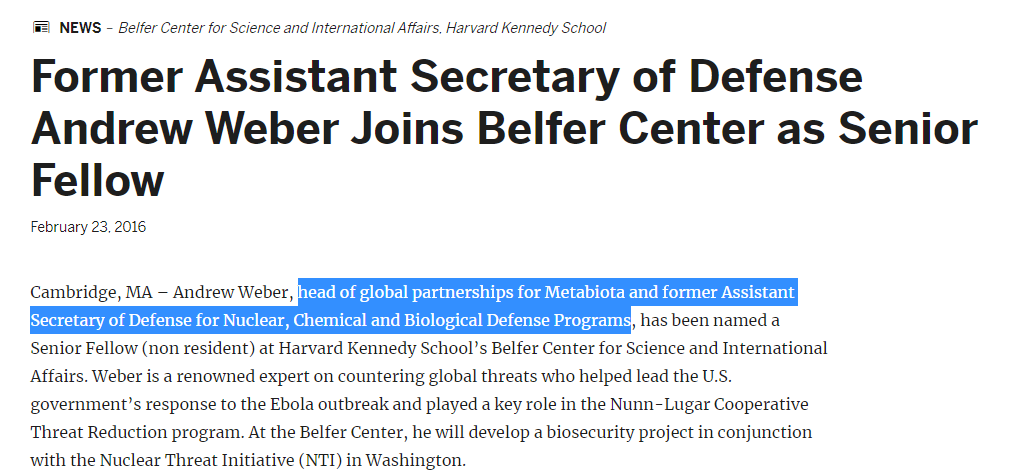而2016年,安德鲁·韦伯曾担任Metabiota公司“全球伙伴关系负责人”。