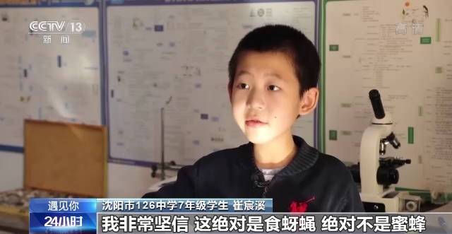 沈阳市126中学7年级学生 崔宸溪:我非常坚信,这绝对是食蚜蝇,绝对不是蜜蜂,虽然它们习性都很像,都吃花蜜,但是蜜蜂,它的肚子胖胖的,而且体表的毛很多,食蚜蝇的体表没有毛,毛很细,看不到,而且它的肚子瘪瘪的,食蚜蝇它的触角很短,几乎看不出来,而蜜蜂的触角比较长,呈膝盖状弯曲,食蚜蝇有两片翅膀,而蜜蜂有四片翅膀,所以我就能鉴定出来,这肯定是食蚜蝇。
