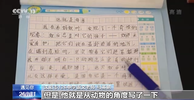 沈阳市126中学语文老师 马英鹂:别人写得一般都是人类社会上关于母亲的事情,但是,他就是从动物的角度写了一下,他不但是去观察,实际在观察的过程中,他还思考,他不只在这过程中看到了、了解了这个昆虫的特征和习性,然后还有一些关于动物情感上,还有人文方面的思考。