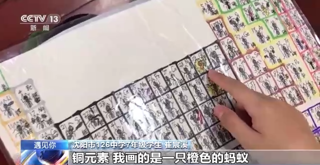 沈阳市126中学7年级学生 崔宸溪:氢元素,它是最轻的元素,我就画的是漂浮的蚂蚁,铜元素,我画的是一只橙色的蚂蚁,头上画一道闪电,表示铜的导电性,锂元素,锂电池,我就给蚂蚁拿着一个电池。