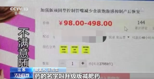被害人 王先生:就在网上看看,正好看到这款减肥药,然后广告打得也比较好,什么十天就能瘦五斤的。药的名字叫那个升级版减肥药,当时我女朋友也是买了十天的量,然后是都吃完了,确实有点效果的,我看她吃了好像瘦了三五斤的。