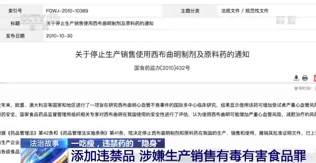 苏州市公安局高新区分局食药环大队民警 陶熠杰:早在2010年,国家食药监部门就明文规定,禁止西布曲明这种成分添加到食品药品中进行销售,售卖含有西布曲明这种违禁成分的食品是违反了我国刑法第一百四十四条的规定,涉嫌生产销售有毒有害食品罪。